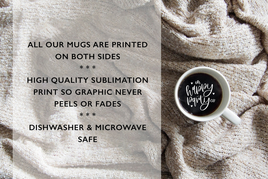 • All of our mugs are top rack dishwasher & microwave safe. We use dye sublimation to print our designs, which means it won’t scratch, crack, peel or rub off like vinyl.